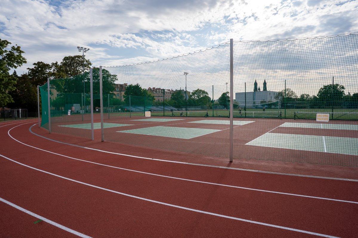 Tartanowa bieżnia lekkoatletyczna, skocznia do skoku w dal oraz wzwyż. Idealne miejsce do uprawiania lekkiej atletyki.
